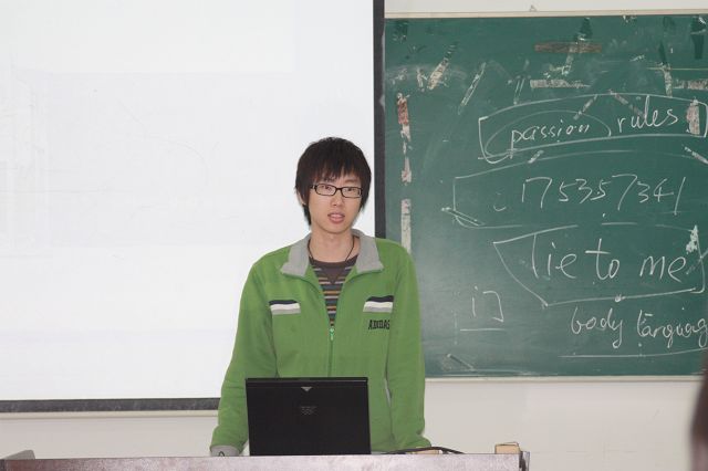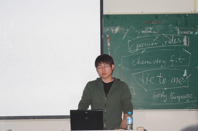 首先,主持人介绍了与会人员,在一片掌声中,金哲宇同学为大家详细的讲解了出国的各种注意事项,包括出国的目的、资金问题、专业选择、语言问题、申请手续等,并着重强调了英语学习的重要性和方法,并提供了一些推荐资料,他告诉所有准备出国的同学一句话:“选择没有对于错,适合的才是最好的。”