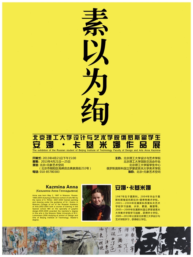 “素以为绚——北京理工大学设计与艺术学院俄罗斯留学生安娜·卡基米娜作品展”,是设计与艺术学院历史上第一次为一位在校学生举办个人画展,也是第一次在校外举办学生作品展览,这既是对安娜同学认真学习的肯定,也表明了学院加强教学与科研的一种态度。