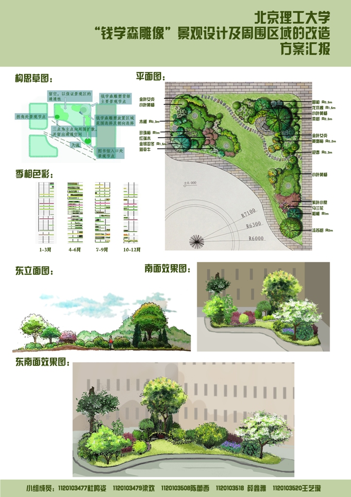 本次展出的方案,作者均为设计学院环境艺术设计系2010级本科生,在专业老师的指导下,学生们将校园景观改造与城市公共空间景观设计、植物景观设计课程学习相结合。在大学生校园景观需求调研、校园植物分析、钱学森像及周边环境分析的基础上,组成七个设计小组分别开展方案设计。所展出的五组方案,通过五个不同方向的设计尝试——小广场主题、植物群落主题、微地形主题、时间寓意主题以及思想迸发主题为立意展开钱学森像的迁移改造景观设计,以求创造美好的校园景观环境,对北京理工大学的校园景观改造作出自己的贡献。