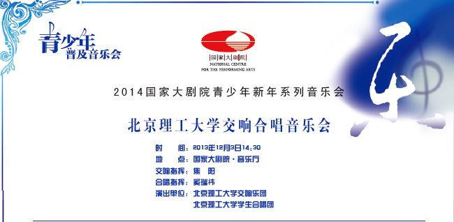 我校大学生艺术团应邀于2013年12月3日14:30在国家大剧院音乐厅举办“北京理工大学交响合唱音乐会”,敬请关注。教职工、校友可凭有效证件在校团委办公室登记取票,数量有限,发完为止。