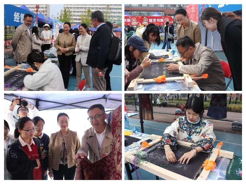 传统服饰,京绣宫扇,京绣绣片,这些个儿非遗老国潮带来了叹为观止的京绣制品视觉盛宴,同学们还有机会在一针一线间亲手体验京绣魅力。堂富贵、绵绵瓜瓞、杏林春燕……陈芳刚对一件件作品如数家珍,开启了一场生动的京绣传承课,将京绣褪去历史的厚重,拨去晦涩的专业,以一种“接地气儿”的方式展现在同学们面前。“之前只知我国非物质文化遗产丰富,如今细细了解到它们的魅力,自豪之感油然而生!”经管学子感叹道。