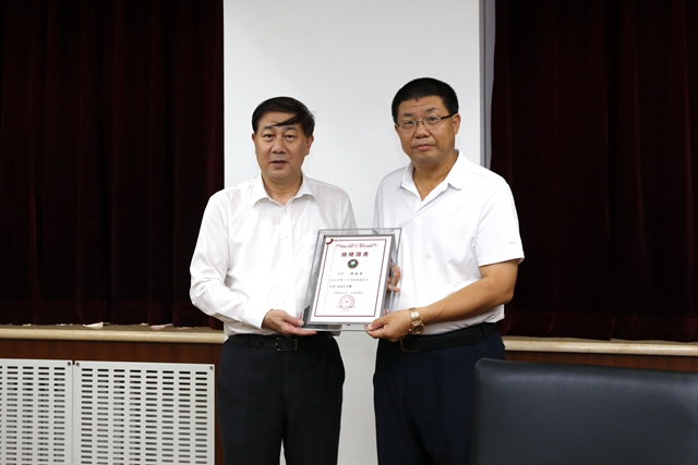 项昌乐代表学校向费振勇校友颁发捐赠证书、赠送纪念品。
